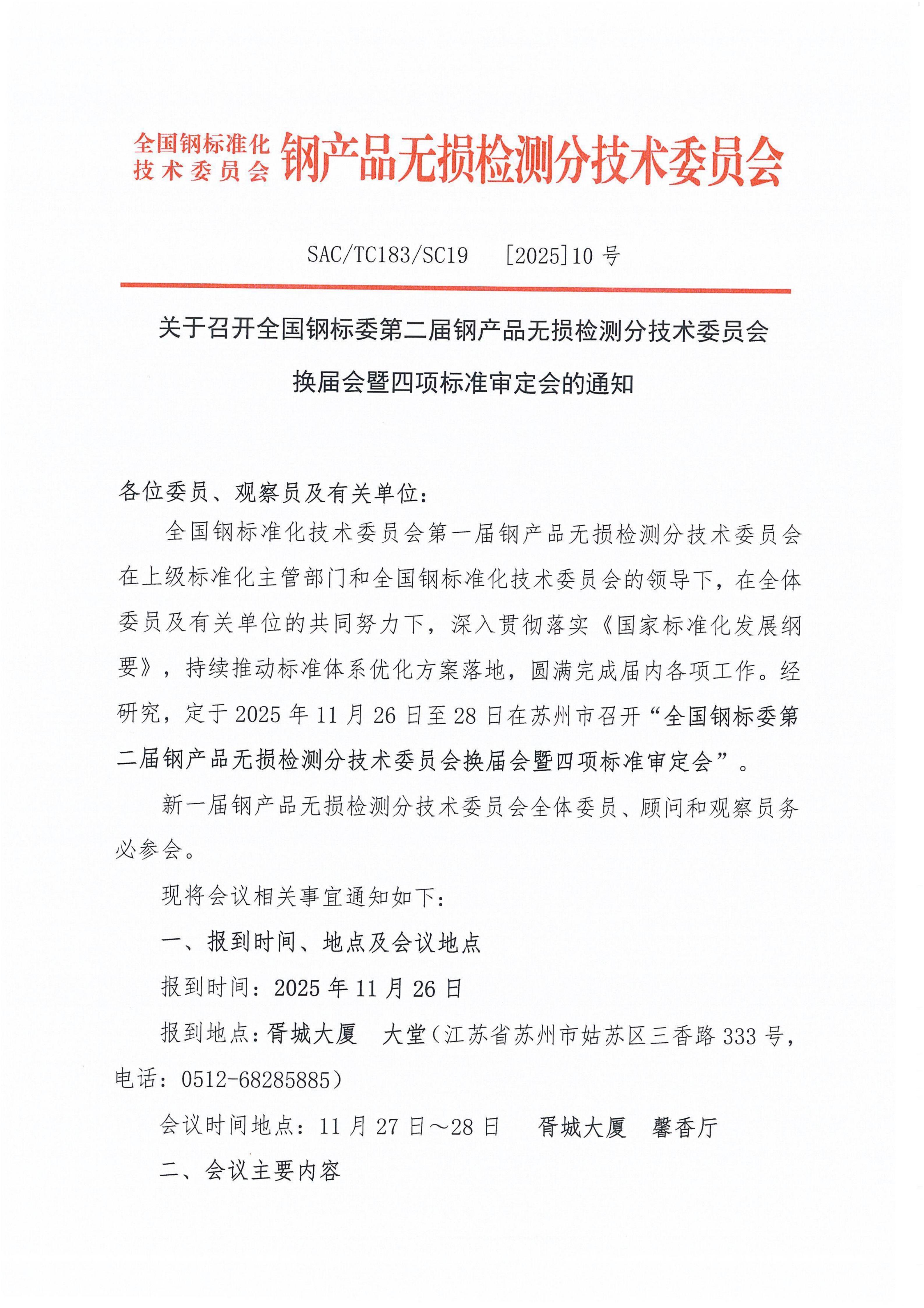 关于召开全国钢标委第二届钢产品无损检测分技术委员会换届会暨四项标准审定会的通知