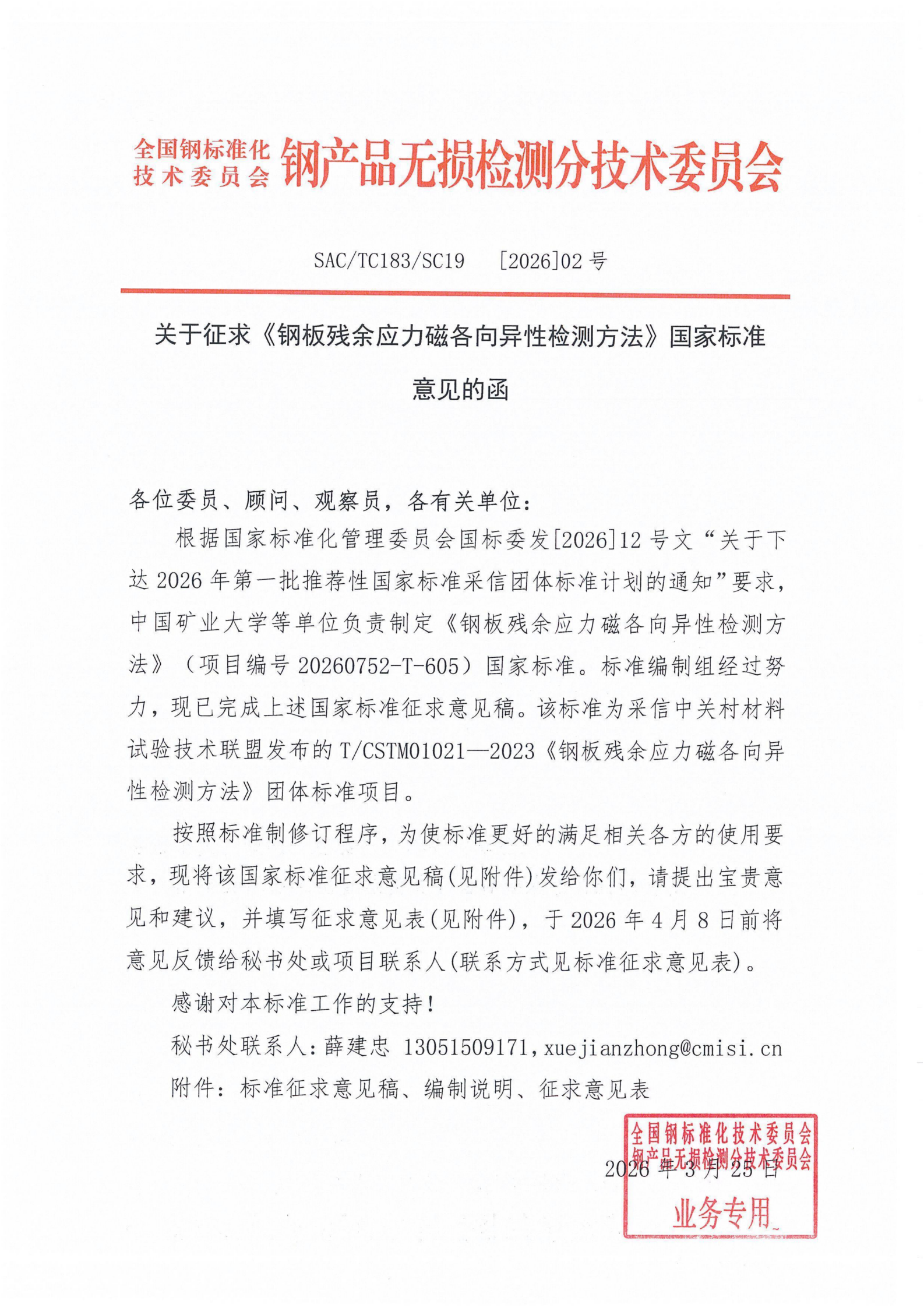 关于征求《钢板残余应力磁各向异性检测方法》国家标准意见的函