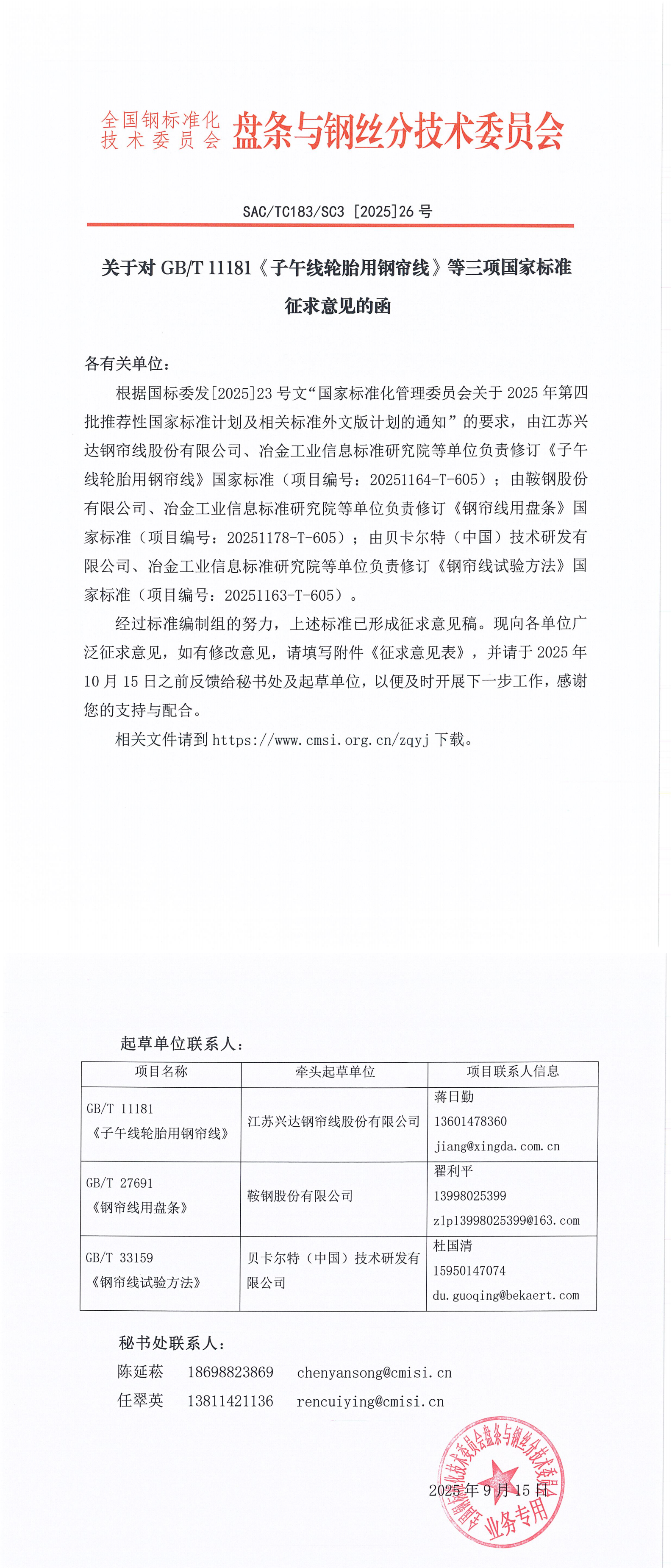 关于对GBT 11181《子午线轮胎用钢帘线》等三项国家标准征求意见的函